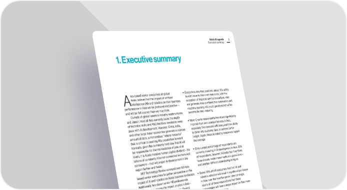 Asia’s AI agenda 3 Executive summary 1. Executive summary sia-based senior executives at global ‹ Executives also feel positively about AI’s ability firms believe that the impact of artificial to add value to their own industries, with the Aintelligence (AI) and robotics on their business exception of financial service executives, who performance in Asia will be profound and positive— are generally less confident that automation and and will be felt sooner than we may think. machine learning will create purely constructive Outside of global robotics industry leaders Korea benefits for their industry. and Japan, most of Asia currently lacks the depth of technical skills and R&D facilities needed to keep ‹ Most C-suite respondents feel AI will significantly pace with AI development. However, China, India, improve their own competitiveness in Asia, and other large Asian economies generate a copious especially their process efficiency and their ability amount of data, a tremendous “natural resource” to delve into customer data to achieve better that is critical to pushing AI’s capabilities forward. insight. Again, financial industry responses lagged Ironically, given the commonly held view that AI will the average. be responsible for disintermediation of jobs at all levels, it is Asia’s massive human capital dividend—the ‹ Only a small percentage of respondents are billions of constantly Internet-connected workers and currently investing in AI development in Asia. 25% consumers—that will propel AI development in the of respondents, however, indicate that their firms region farther and faster. have already made investments at a global level— MIT Technology Review surveyed over 60 Asia- and another 50% are considering doing so. based senior executives to gather perspective on the impact of AI and robotics on Asia’s business landscape. ‹ Some 70% of HR executives feel that AI and Additionally, two dozen senior HR professionals robotics adoption will result in significant job losses were polled to assess the impact on jobs in Asia— in Asia over the next five years. Unsurprisingly, and the future of their roles in particular. Several nearly all of these respondents feel these in-depth interviews were conducted with AI industry technologies will have a major impact on their roles technologists, investors, and application developers. and functions in the future. The key findings of this research are as follows: ‹ Specifically, HR managers and talent professionals ‹ Overwhelmingly, respondents feel technological feel that their roles will evolve into broader, and advancements in AI and robotics will have very more strategic, “productivity management” roles; positive effects on most industrial sectors in Asia. two-thirds of them say their roles will encompass the management of both human and artificial talent ‹ They also believe even more strongly that these in the next five years. technology advancements will specifically improve their own firms’ competitiveness. © MIT Technology Review, 2016. All Rights Reserved.