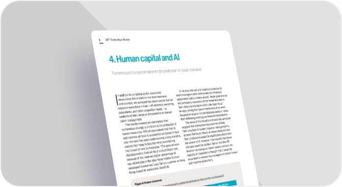 MIT Technology Review 8 4.Human capital and AI Tremendous change is imminent in the profession of human resources n addition to compiling senior executives’ In his view, this not only heightens anxieties for views about AI’s impact on the Asian business talent managers within enterprises but influences Ienvironment, we surveyed two dozen senior human government policy makers as well. “Asian governments resource executives in Asia—HR directors, recruiting are particularly suspicious of the threat AI poses to consultants, and talent acquisition heads—to their efforts to transform skills in the labor force,” understand their views on AI’s potential to disrupt he says, noting that “governments should be more talent management. focused on ways to retrain displaced workers” rather The results revealed an assumption that than defending existing jobs from disintermediation. tremendous change is imminent in the profession of The views of the industry professionals surveyed human resources: 70% of respondents feel that AI suggest that enterprises may soon be shifting and robotics will lead to substantial job losses in Asia their practices in human resource management to over the next five years, underscoring a long-standing achieve that focus. Nearly all respondents felt that anxiety that many in Asia feel when considering their professions would be significantly altered with the impact of new technologies. “The pace of work the advent of AI. However, they also felt that these displacement in Asia will be at a much faster rate, changes would be positive. Rather than the HR because of the relatively higher percentage of function narrowing as robots replace workers, the low-skilled jobs in the labor force relative to more majority of respondents thought that it would be developed economies” says Tak Lo, a partner at Hong expanded to oversee the management of both human Kong–based AI accelerator Zeroth.AI. and machine productivity. Figure 4: Human resources Will advancements in AI and robotics lead to substantial job losses in Asia over the next five years? (% of respondents) Yes (70.8%) No (29.2%) Will these technologies have a major impact on the role and function of the HR chief? (% of respondents) Yes (87.5%) No (12.5%) How will the role of the HR function change with advancements in AI and robotics? (% of respondents) HR will be tasked with managing overall productivity, HR will keep managing people, and therefore both man and machine (66.7%) and only people (33.3%) Source: MIT Technology Review © MIT Technology Review, 2016. All Rights Reserved.
