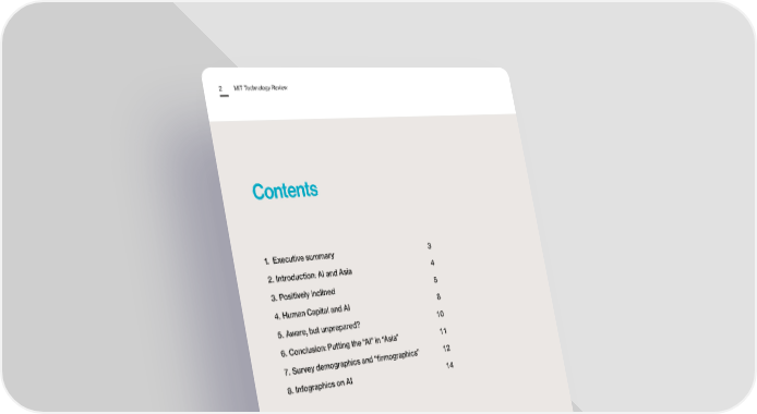 MIT Technology Review 2 Contents 1. Executive summary 3 2. Introduction: AI and Asia 4 3. Positively inclined 5 4. Human Capital and AI 8 5. Aware, but unprepared? 10 6. Conclusion: Putting the “AI” in “Asia” 11 7. Survey demographics and “firmographics” 12 8. Infographics on AI 14 © MIT Technology Review, 2016. All Rights Reserved.
